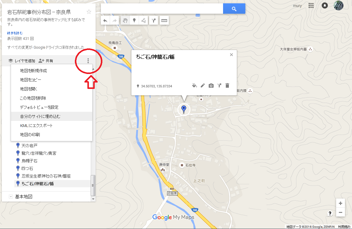 2016年版 Googleマップ マイマップ で指定の場所を地図の中央に表示して埋め込む方法 石神 磐座 磐境 奇岩 巨石と呼ばれるものの研究